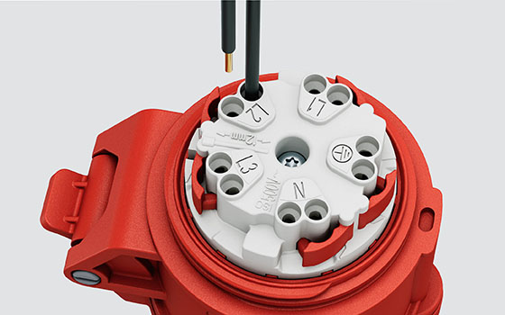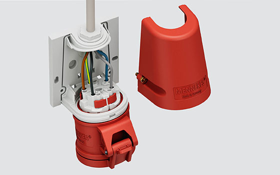 MENNEKES-stikkontakter for påmontering i 16 og 32 A er tilgjengelige med den ekstra tidsbesparende og skrueløse fjær-klem-teknikken TwinCONTACT. Her avisolerer du ledningene før du enkelt fører dem inn i stikkontakten uten bruk av verktøy. Dobbeltklemmer med kode sørger for at lederne kobles til riktig. Hvis du vil løsne en leder, er det bare å trykke på den røde løsneknappen – da kan du enkelt trekke ut lederen.