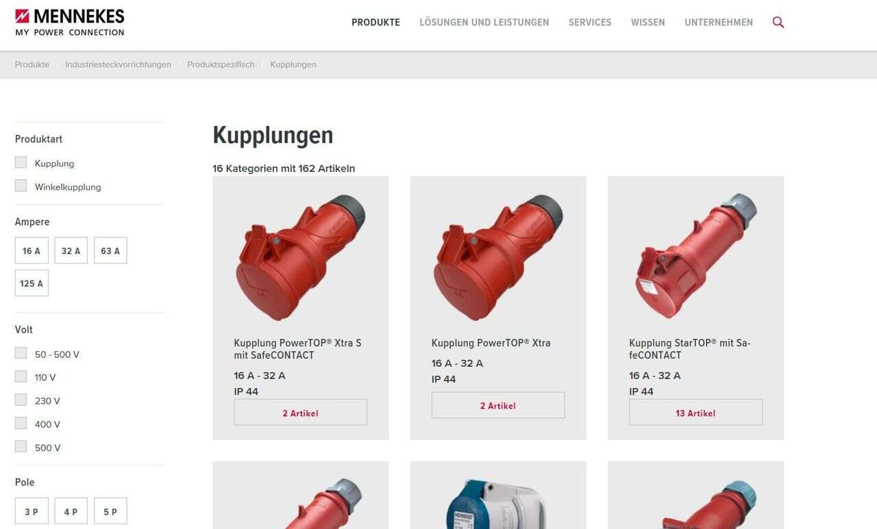 Ein weiteres Plus: der leistungsfähige Produktfilter, der das gezielte Identifizieren und Priorisieren der relevanten Lösungen spürbar beschleunigt. Ein großer Vorteil speziell bei besonders umfangreichen Produktsegmenten wie zum Beispiel Steckern, Kupplungen und Kombinationen. Hier sorgen die in die Übersichtsseiten integrierten Teaser-Elemente zusätzlich für einen schnellen Einstieg in das gewünschte Produktthema. Und wer häufig mit Mobilgeräten im Netz unterwegs ist, wird sofort die aufgeräumte Darstellung der MENNEKES-Internetseiten auf Smartphone und Tablet zu schätzen wissen.