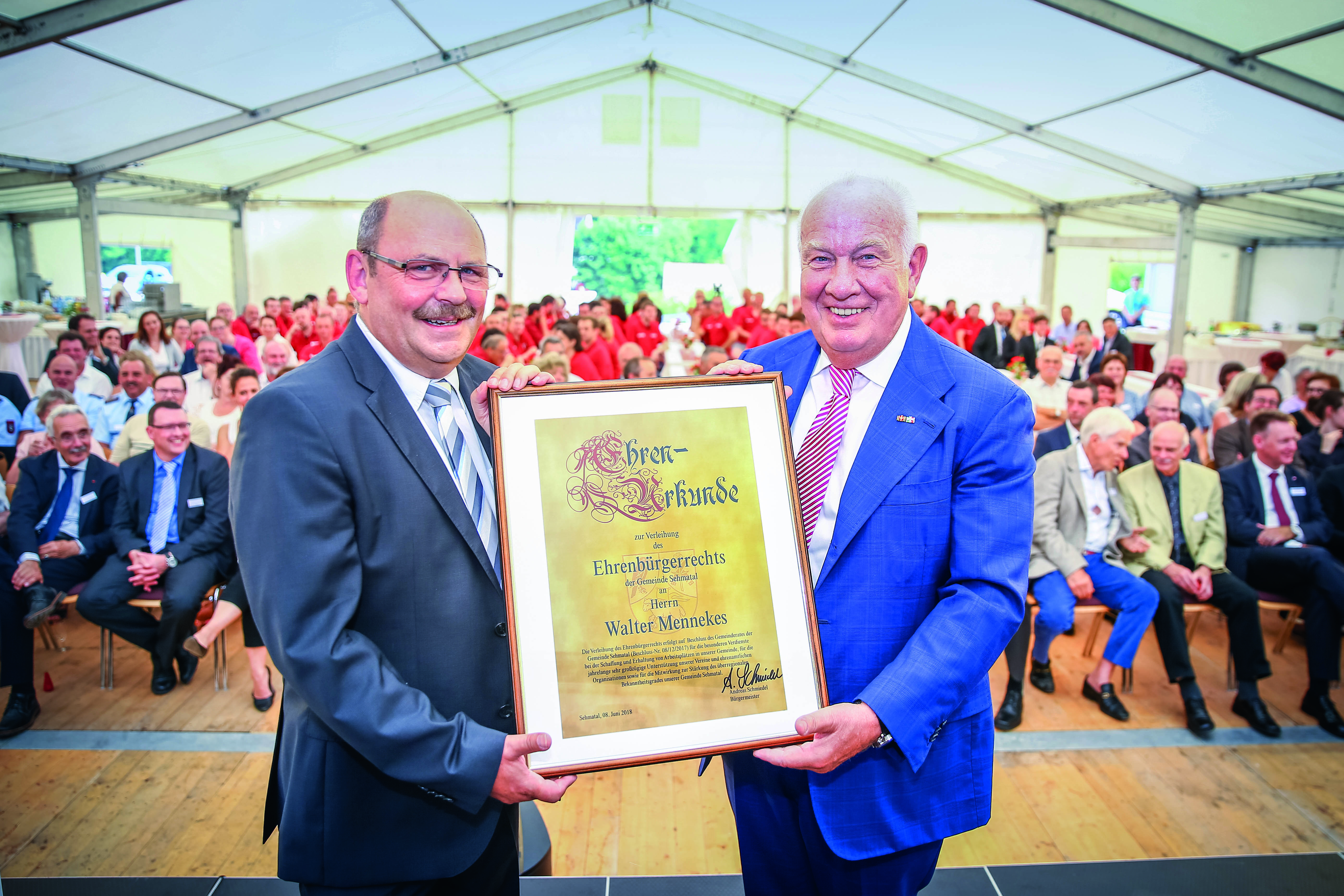 Bei der Auszeichnung durch Bürgermeister Andreas Schmiedel, zeigte sich der neue Ehrenbürger emotional sehr bewegt. Die Verleihung sei ein Zeichen dafür, „dass wir hier angekommen sind – das Unternehmen Mennekes, wie auch die Unternehmerfamilie Mennekes gleichermaßen“. Die Ehrung verstehe er als Ansporn für die Zukunft und für ein „auch weiterhin erfolgreiches unternehmerisches Engagement hier in Sehmatal.“